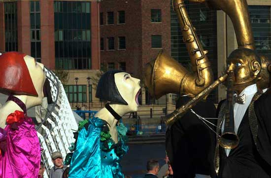 working in collaboration with richard broderick we produced the 'mortal orchestra' street show which has toured throughout the UK , Europe and the USA.The mortals are made using the catalan carton technique which Iintroduced to the north east after learning from catalan artists working with MIA in manchester. |